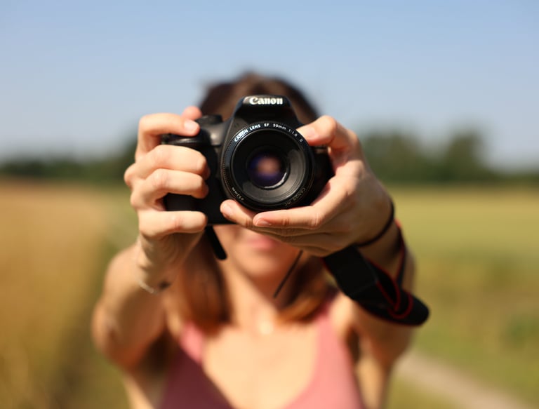 A person with long dark hair and glasses is holding a professional camera with a large lens, standing in an outdoor setting. A photography reflector is positioned nearby, indicating a photoshoot. The background shows blurred trees and greenery.